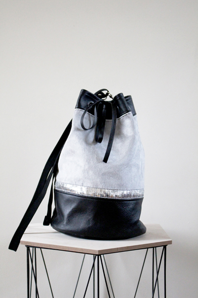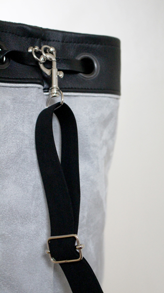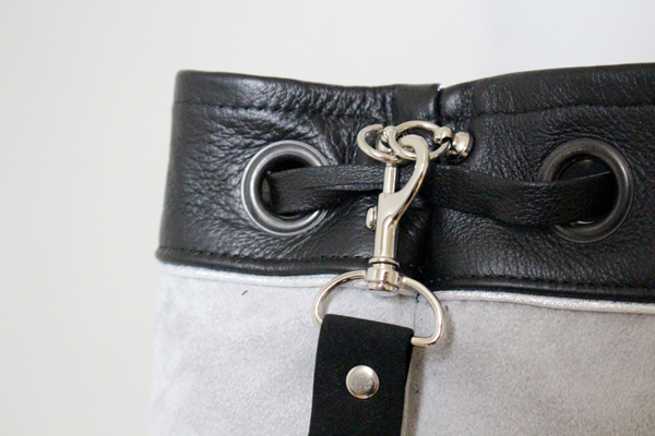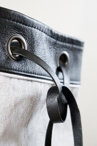 La fermeture du sac se fait avec un système d’oeillets en métal et un cordon en cuir de veau plat à nouer. Toute simple, pas de pompons, de stop-lacets ou autre, le cuir fait son effet à lui seul je trouve…