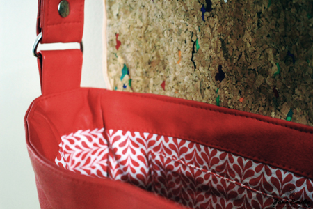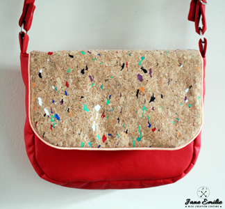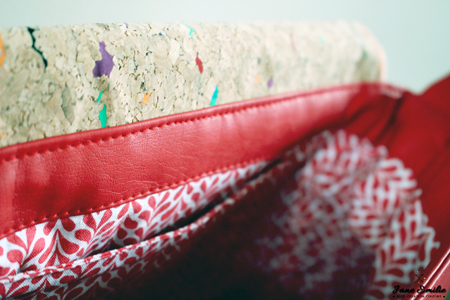 Pour ce faire, j’ai choisi le mariage d’un beau simili cuir rouge, de mon fameux liège tacheté, d’un passepoil corail et d’une jolie doublure aux motifs graphiques.