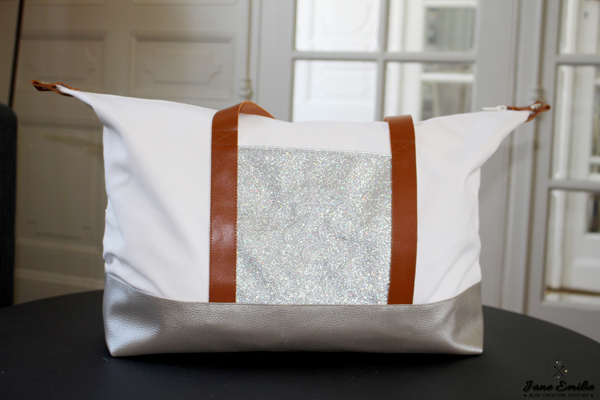 J’ai également ajouté une poche plaquée en tissu pailleté argent sur laquelle j’ai brodé un petit logo aux initiales de mon prénom. J’adore personnaliser les sacs de voyages surtout quand il s’agit du mien 🙂