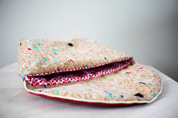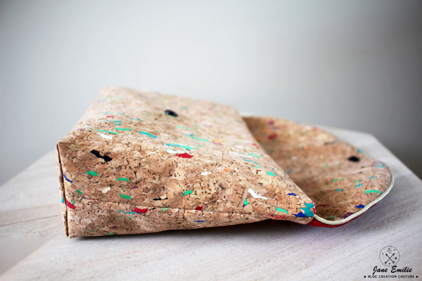 Le corps de le pochette est réalisé dans un liège tacheté multicolore mais libre à vous d’en changer la matière ! Je vous conseille cependant si vous choisissez un tissu léger, de l’entoiler pour conserver un bon maintien…