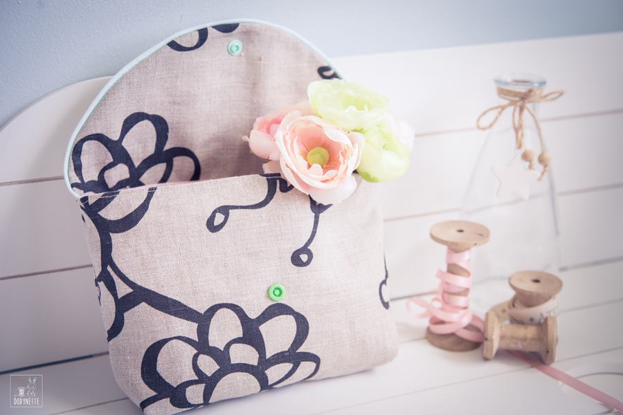 Pour confectionner sa version de la Pochette Mini-Pollock, Elodie a choisi un magnifique lin aux motifs doux et poétiques ainsi qu’un très beau tissu enduit de chez Lina Morata pour le rabat.