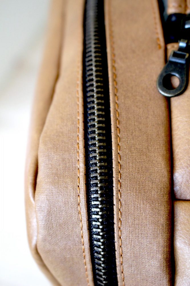 Pour plus de difficulté, j’ai entoilé toutes les pièces de simili cuir avec du decovil et je me suis régalée ! Encore une fois, la Power Fabriq a réalisé des merveilles. J’ai pris plaisir dans toutes les étapes de la confection du sac, assemblages et surpiqures, que du bonheur !