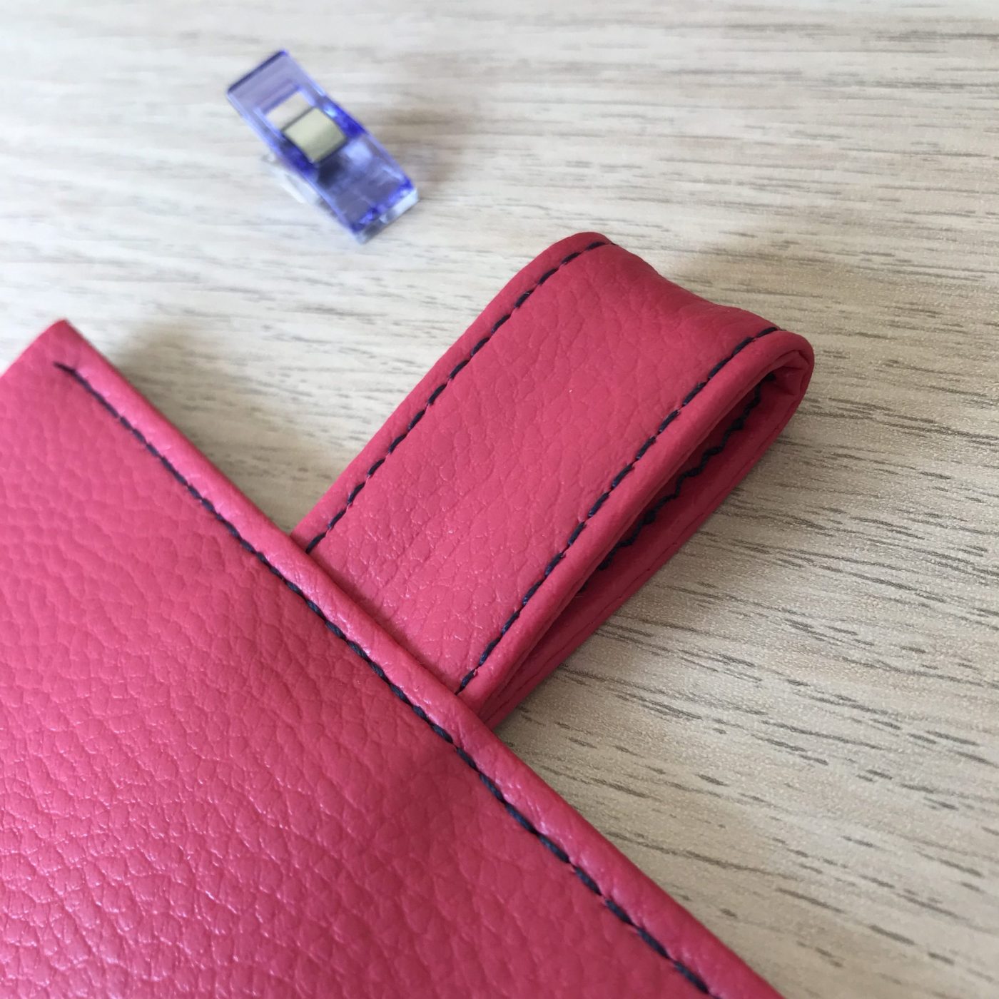 J’ai donc décidé de corser un peu les choses en utilisant 10 couches d’un simili que j’adore (le simili-cuir club fauve effet cuir de la Mercerie des Créateurs), à la fois épais mais un peu souple et élastique donc aïe aïe aïe !!! Et devinez quoi, elle a une fois de plus avalé les épaisseurs comme une lettre à la poste !