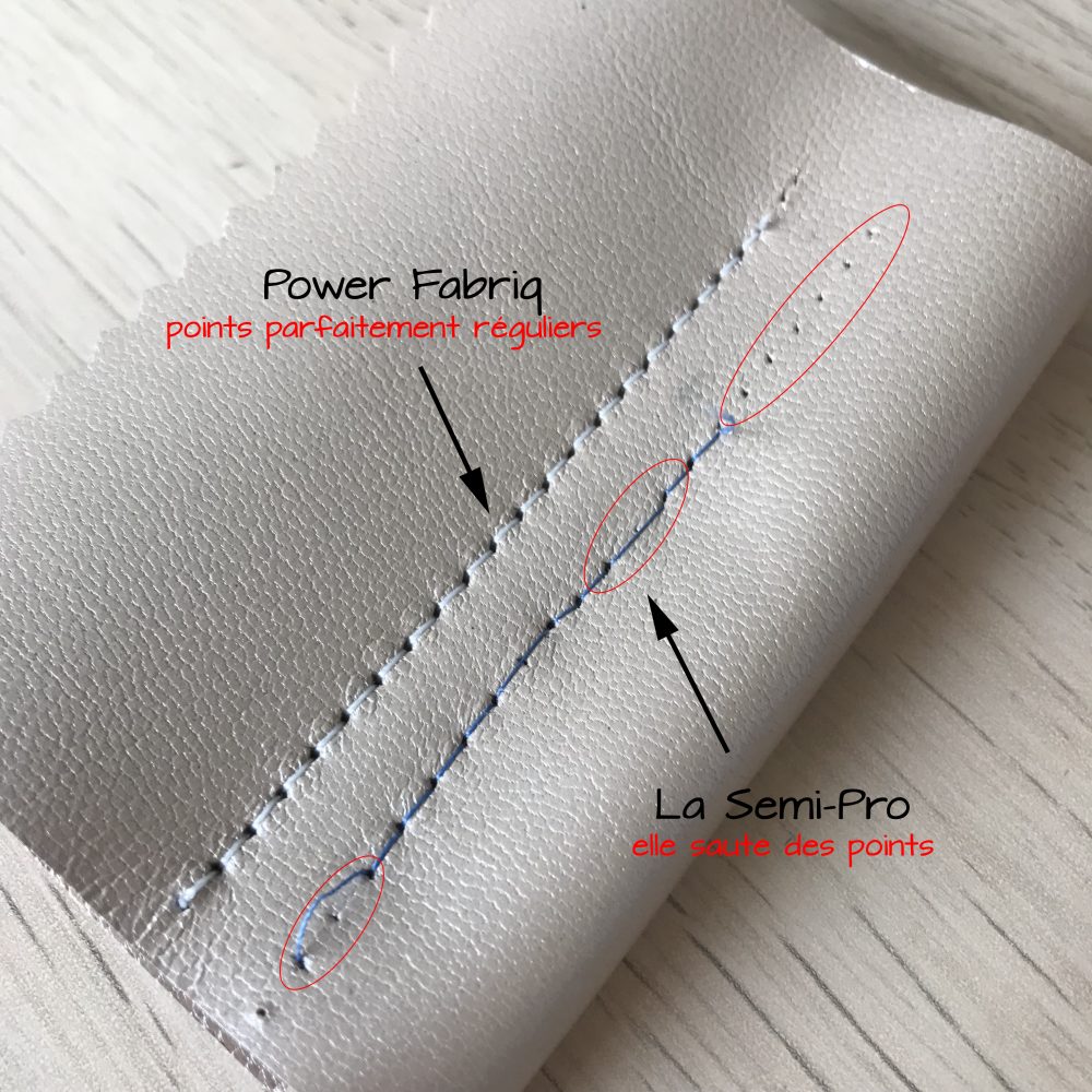 Phase de test sur simili-cuir terminée ! Relevée haut la main ! La MAC avale les épaisseurs sans rechigner, elle ne saute aucun point et je dirais même qu’ils sont parfaitement réguliers !