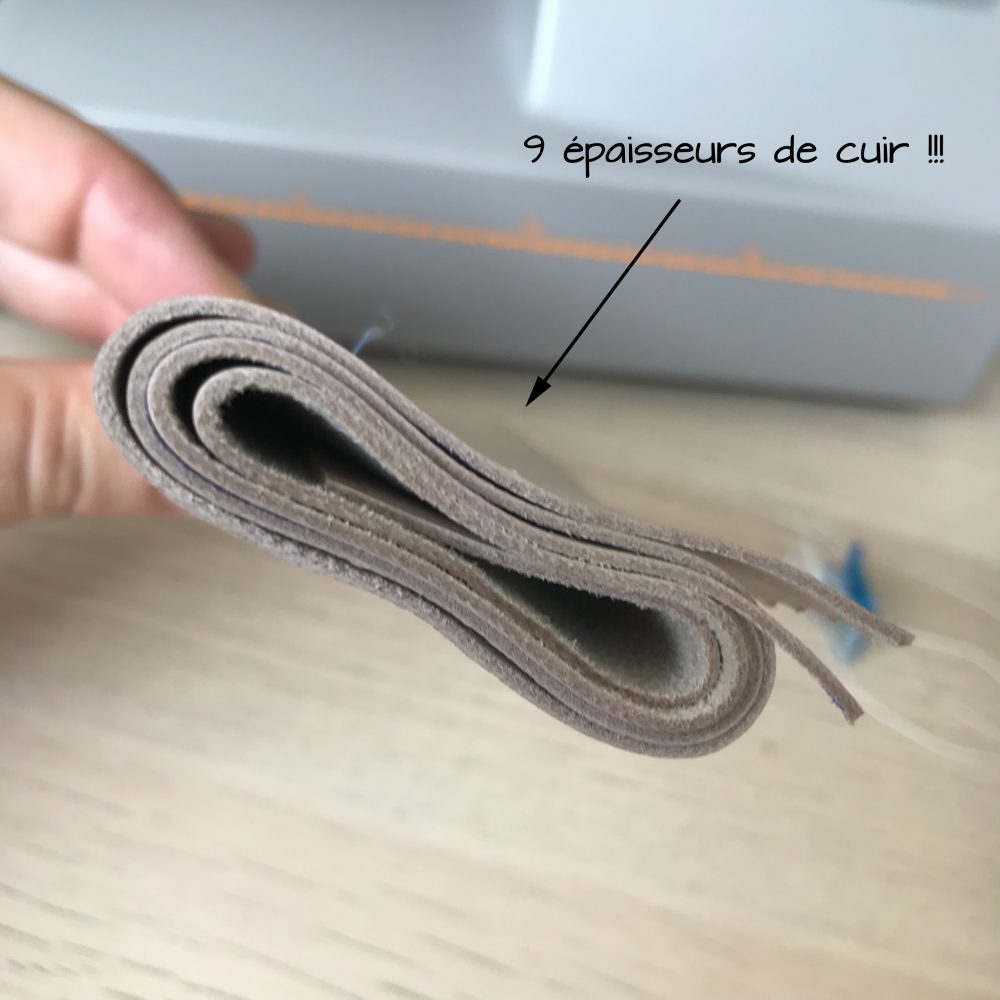 Devant tant de facilité, je décide alors de pousser la MAC au maximum de ses capacités afin d’en voir ses limites… J’insère donc autant d’épaisseurs que possible sous le pied de biche, 9 épaisseurs de cuir !!!