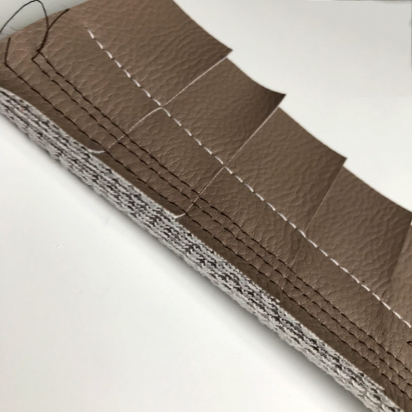 Je l’équipe donc de son pied standard et j’embraye l’IDT. Je découpe pas moins de 9 morceaux de simili cuir que j’assemble soit une épaisseur de 1 mm jusqu’à 9 mm !
