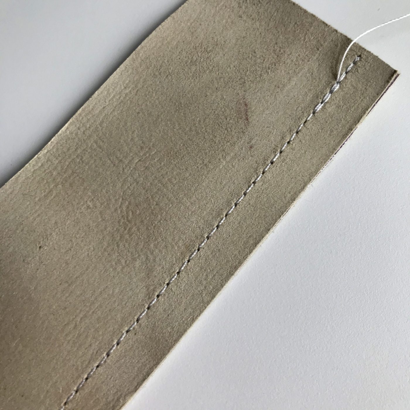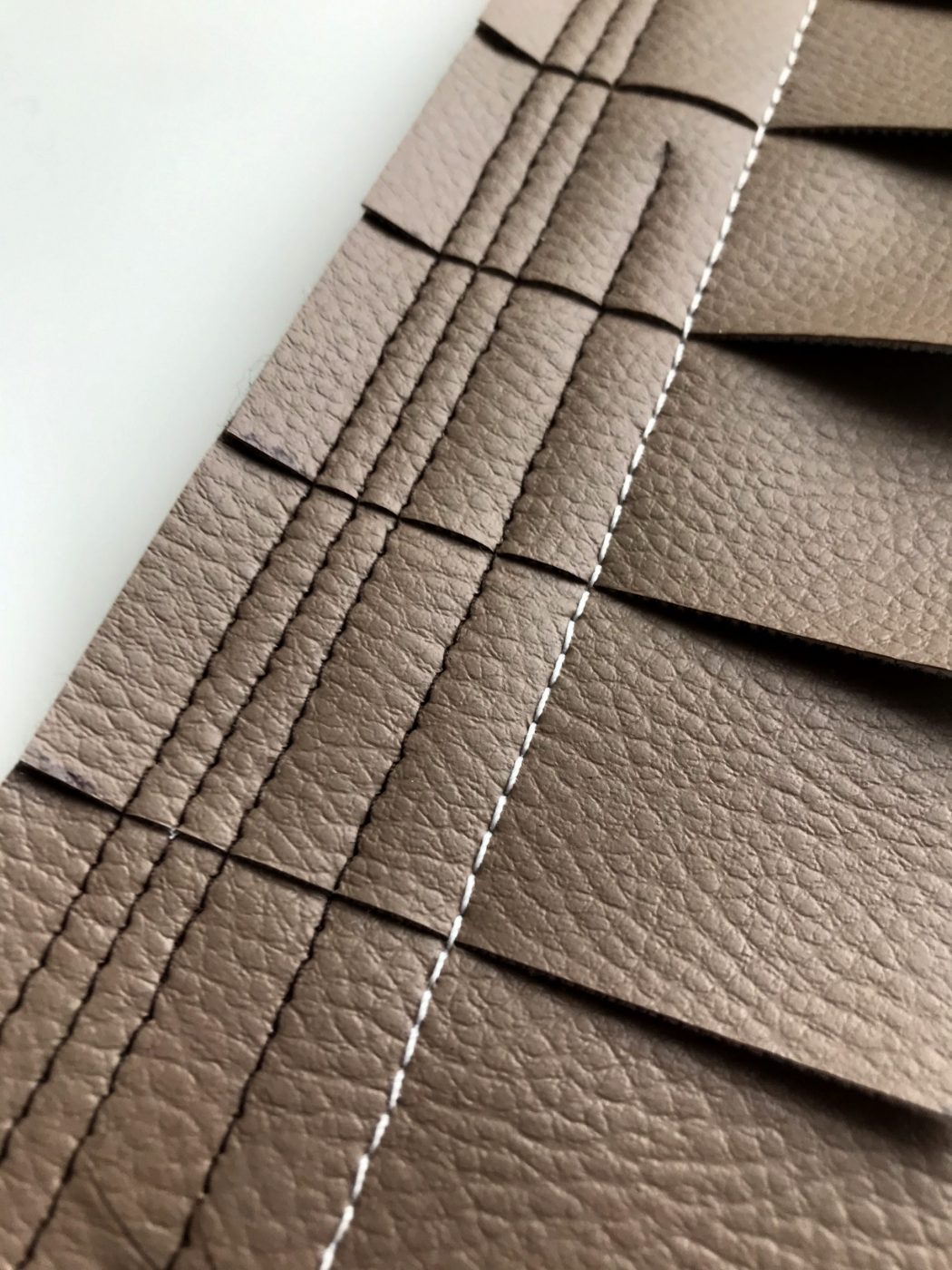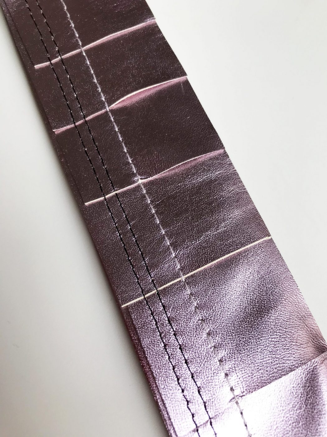 J’ai commencé la couture sur la partie la moins épaisse du simili pour finir sur la partie la plus épaisse, en augmentant progressivement la longueur du point de 2,5 mm à 4,5 mm.