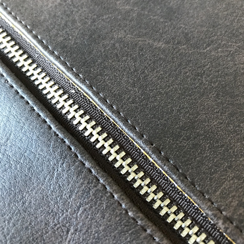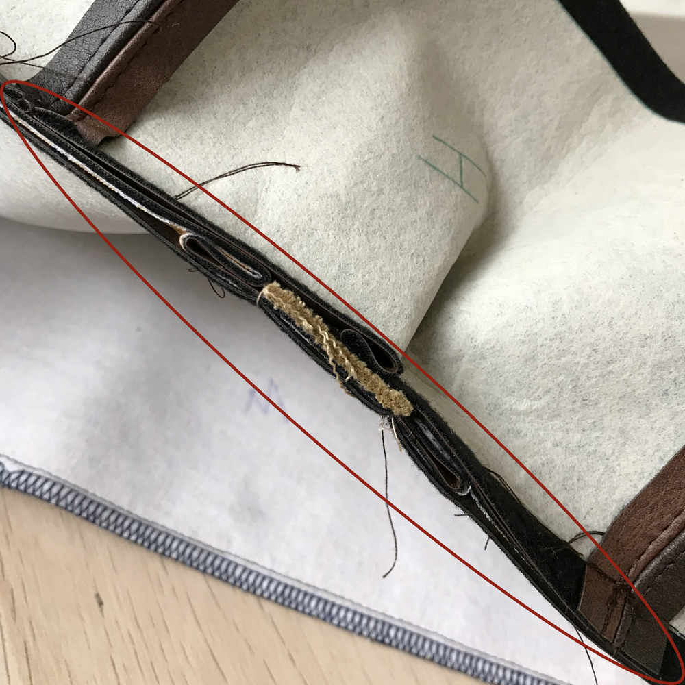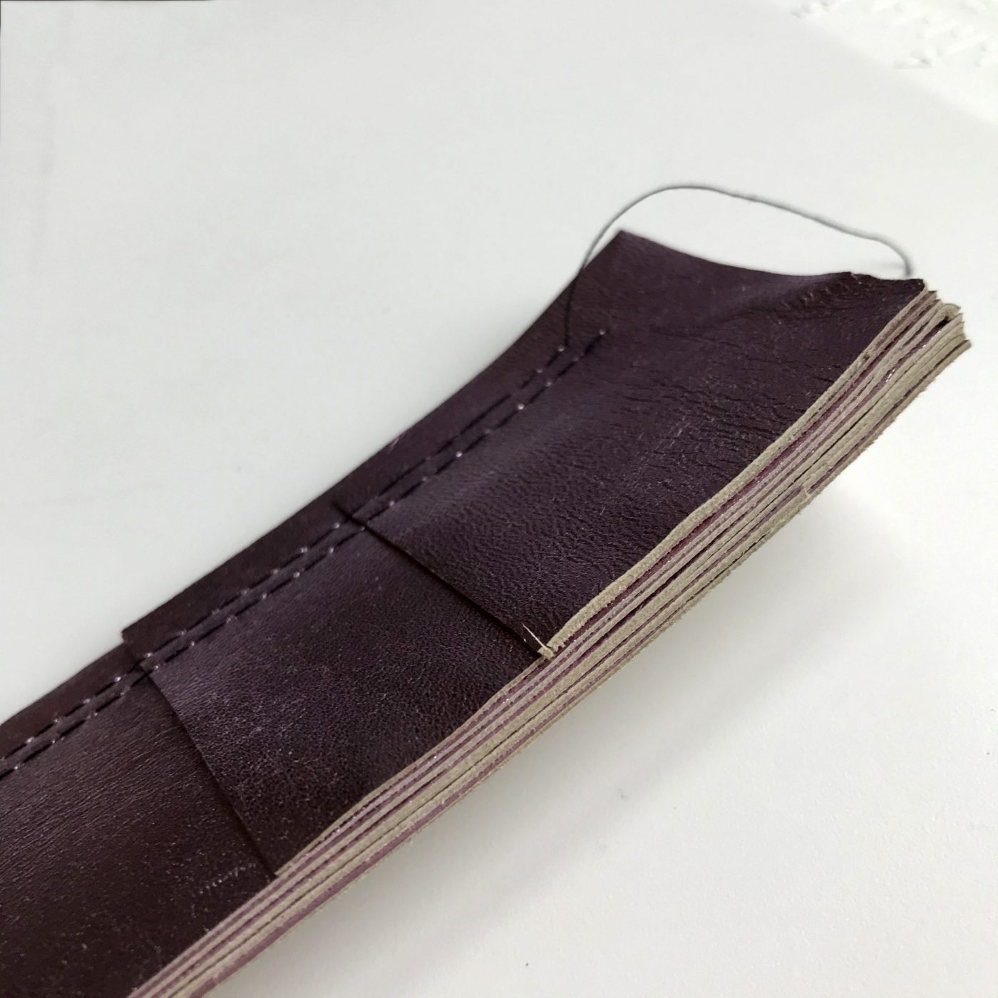 J’ai commencé la couture sur la partie la moins épaisse du simili pour finir sur la partie la plus épaisse, en augmentant progressivement la longueur du point de 2,5 mm à 4,5 mm.