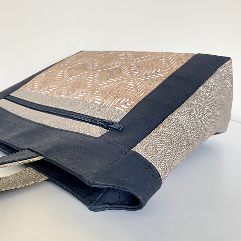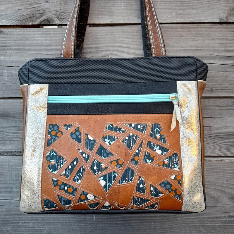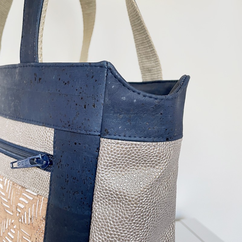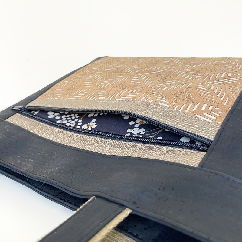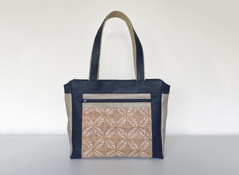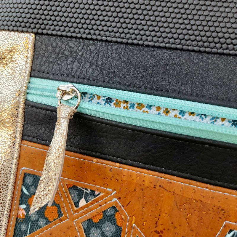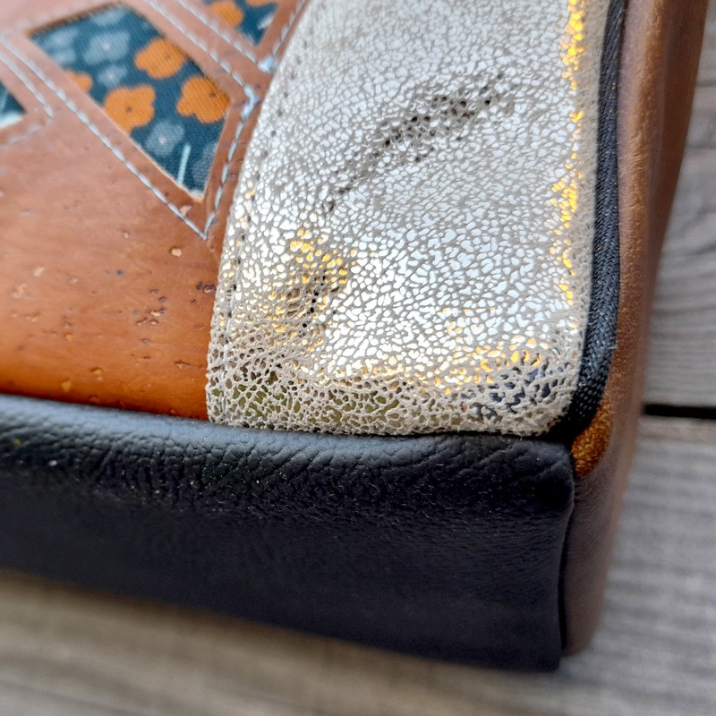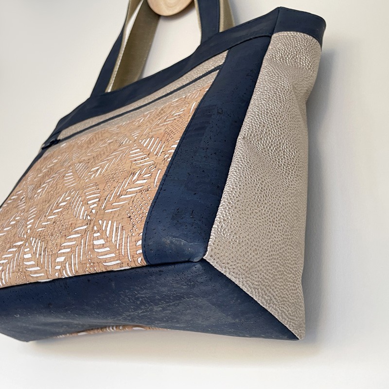 Attention également aux épaisseurs. Les matières utilisées pour notre prototype étant du liège et du simili de très bonne qualité, nous n’avons pas utilisé d’entoilage ou de mousse sur nos pièces extérieures (sauf pour le fond). Si vous souhaitez en ajouter, assurez vous auparavant d’avoir une machine à coudre capable de coudre les épaisseurs.