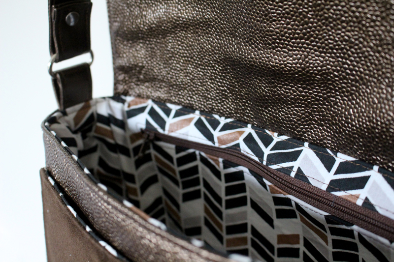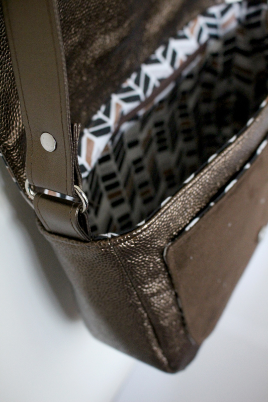- Un magnifique simili cuir Bubbles bronze de ma mercerie de proximité « Tissus du centre » à Laval. Texturé et légèrement irisé, il est juste à tomber !